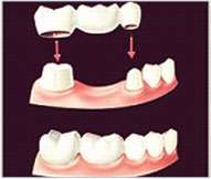 A bridge is made to replace one or more missing teeth. Bridges can be supported by natural teeth, by a combination of teeth and implants or just by implants. A traditional bridge is made by creating a crown for each tooth on both sides of the space and placing a false tooth between the crowns. The crowns can be supported by natural teeth or by implants. When the crowns are placed, the false tooth fills the space left by the missing tooth or teeth.